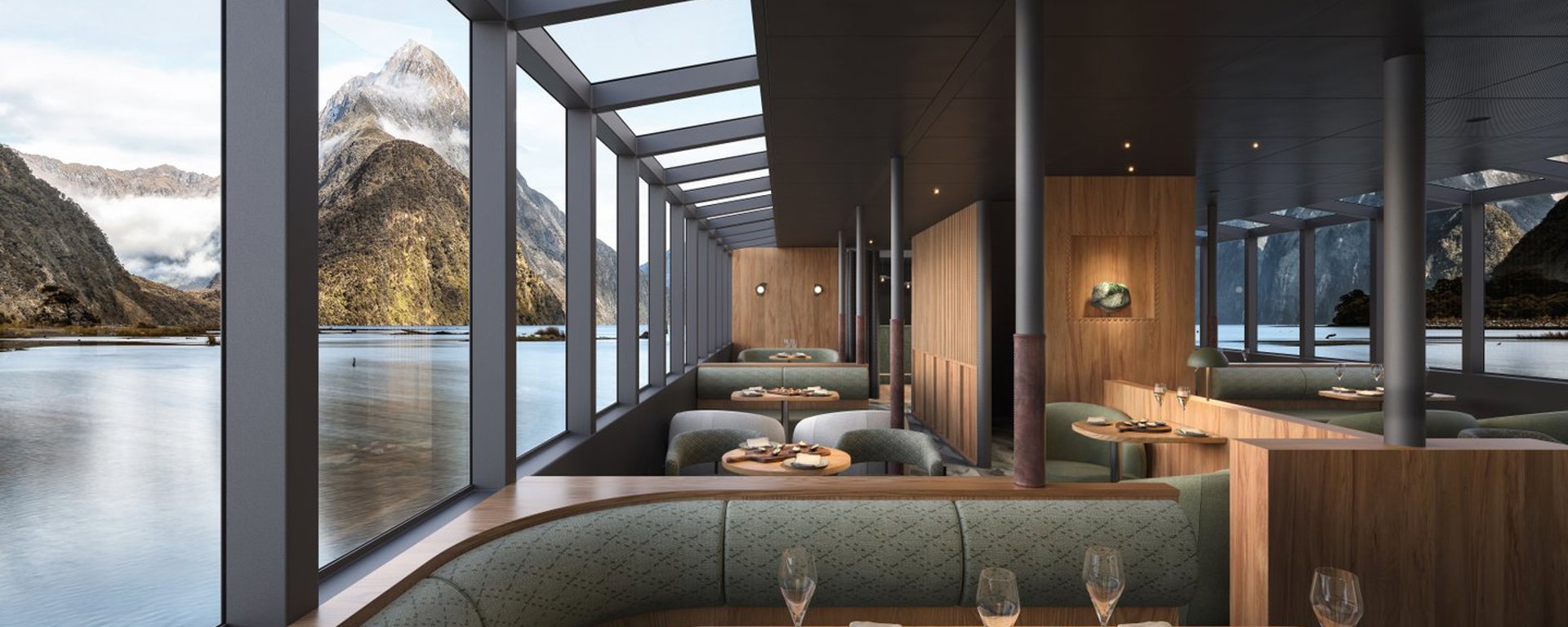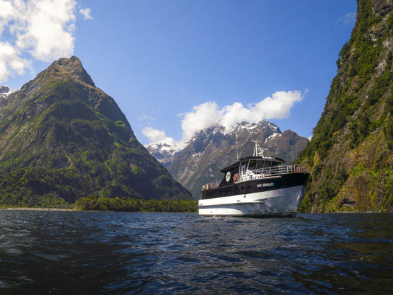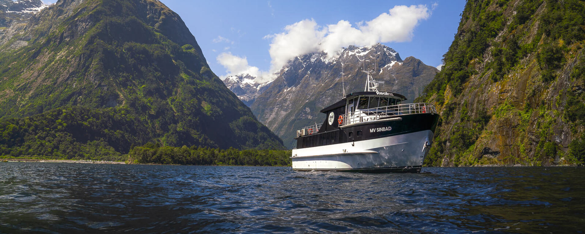 Board the MV Sinbad for a refined small-group cruise through Milford Sound. The boat's bespoke design and intimate atmosphere create the perfect setting to enjoy the dramatic beauty of the fiord in comfort and style.