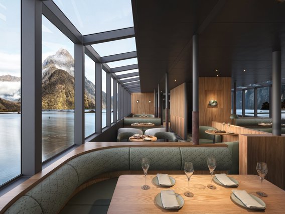 Once aboard your cruise on MV Sinbad, you’ll be welcomed with a glass of NZ Cloudy Bay sparkling wine as the boat cruises into the heart of Milford Sound. As the landscape unfolds around you, enjoy a five-course tasting menu curated by renowned New Zealand chef Tom Hishon. Each dish is inspired by the wild, seasonal ingredients of Fiordland — a reflection of place, crafted with care and served with purpose. Dietary preferences and requirements are thoughtfully accommodated with prior notice, ensuring every guest feels considered.