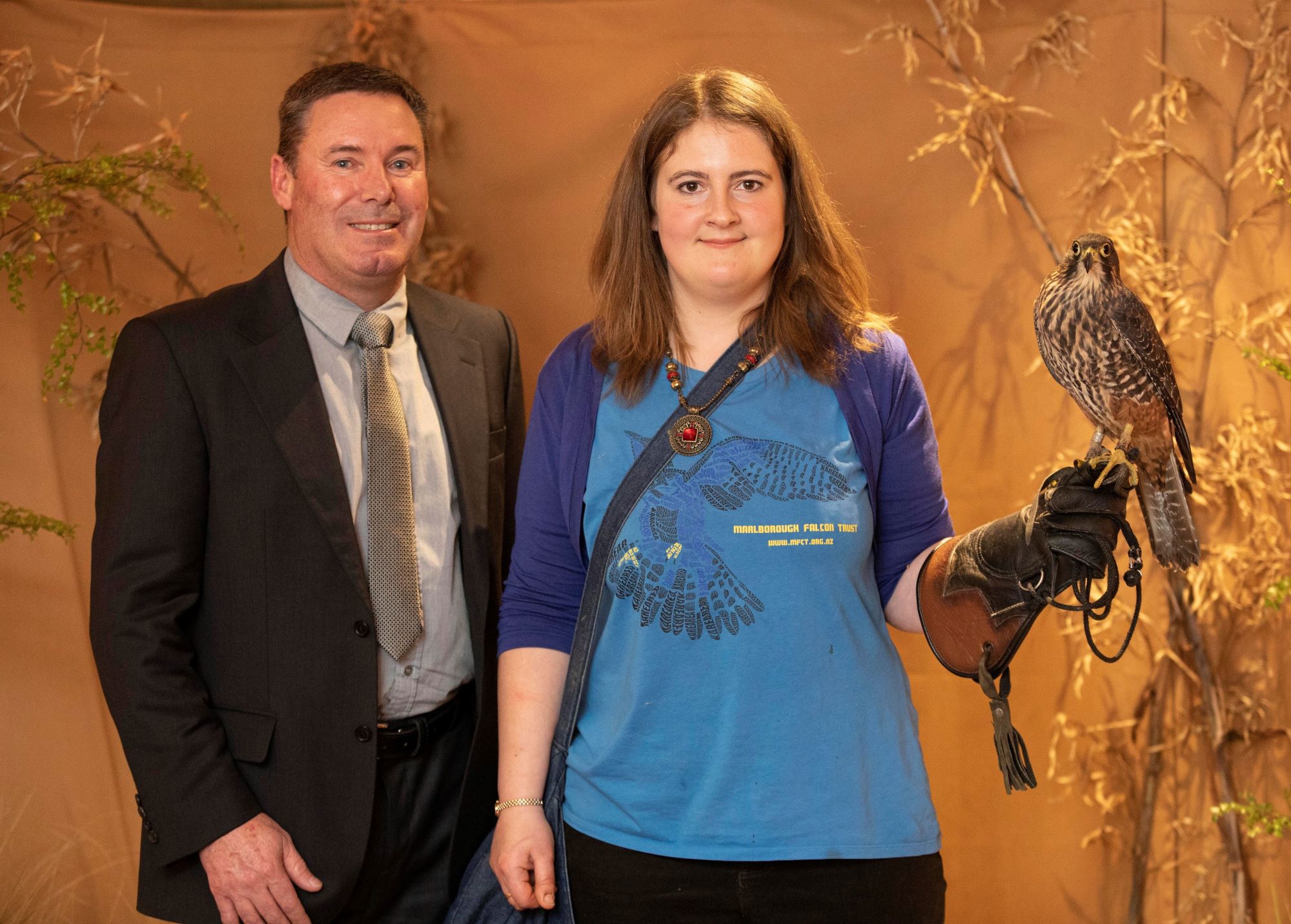 Real Journeys General Manager Paul Norris with Dr Victoria Smith from the Marlborough Falcon Trust and Hera the kārearea
