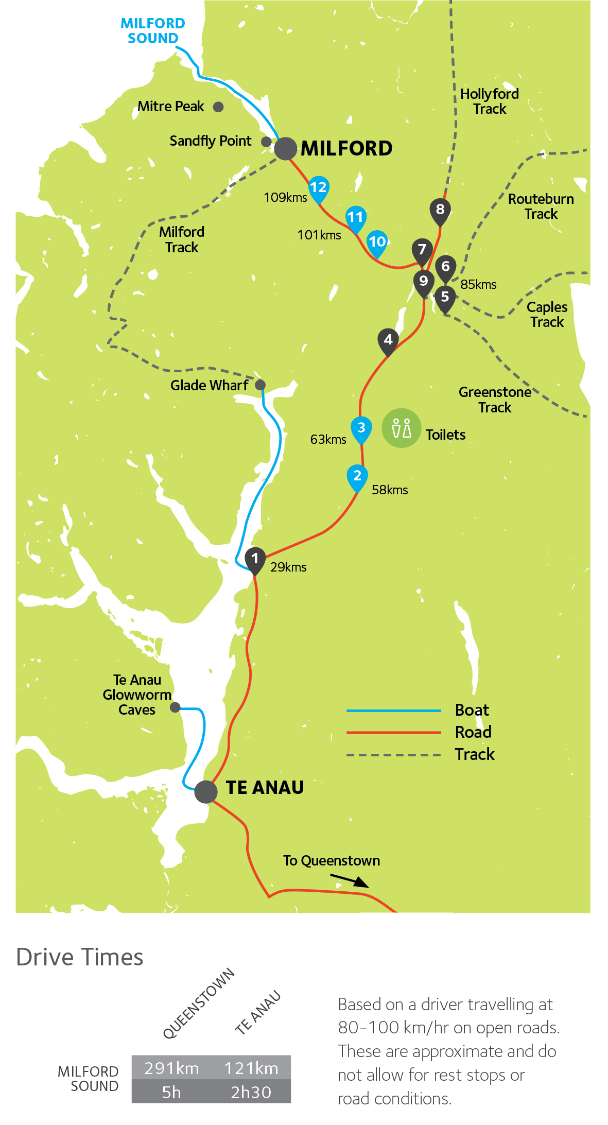 The Hollyford Road turn-off leads to the Lake Marion Walking Track, Gunns Camp, Humbolt Waterfall and Hollyford Track.