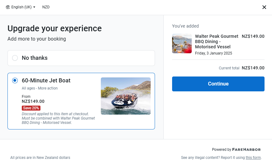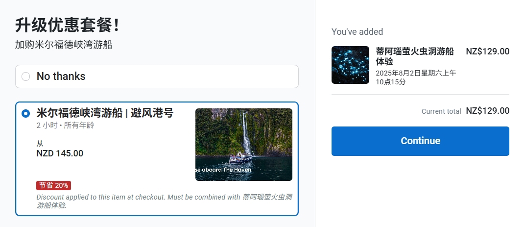 1. 官网预定:RealNZ官网预定以下项目时,记得可以加选第2项体验哦!一旦加入购物车,系统会自动帮您把第2项体验打8折。请按正确顺序把组合项目加到购物车里,才能享受这个优惠!